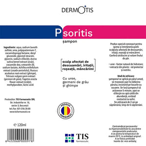 Entdecken Sie PsoriTIS 10% Urea Shampoo, 120 ml – ein rumänisches Dermatokosmetikum von Tis Farmaceutic. Speziell entwickelt für Kopfhaut, die zu Psoriasis, seborrhoischer Dermatitis, Schuppen, Pityriasis und Ichthyose neigt. Spendet Feuchtigkeit, beruhigt und unterstützt die Schuppenentfernung mit Weizenkeim- und Mäusedornextrakt.