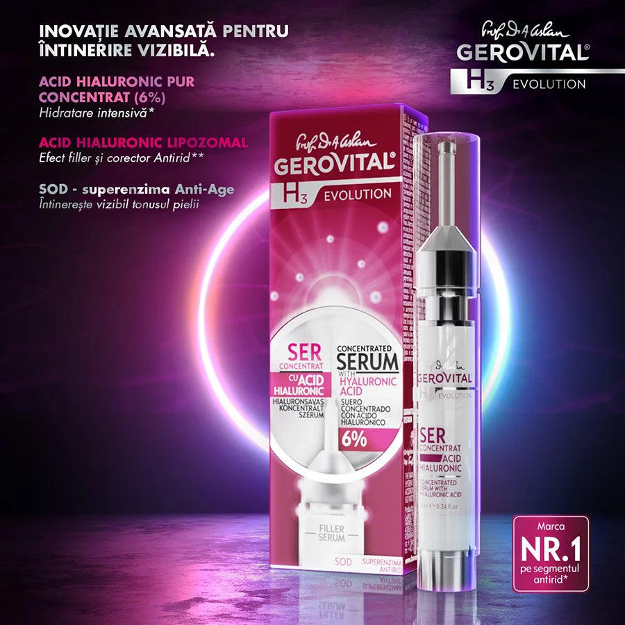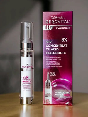 Wir präsentieren das konzentrierte Serum mit 6 % Hyaluronsäure von Gerovital H3 Evolution – ein 10-ml-Serum für intensive Feuchtigkeitspflege und Anti-Aging-Wirkung. Reich an reiner Hyaluronsäure und liposomaler Säure, liposomalem Vitamin C, SOD, GP4G und Trylagen, bietet dieses Serum eine umfassende Lösung gegen Hautalterung.