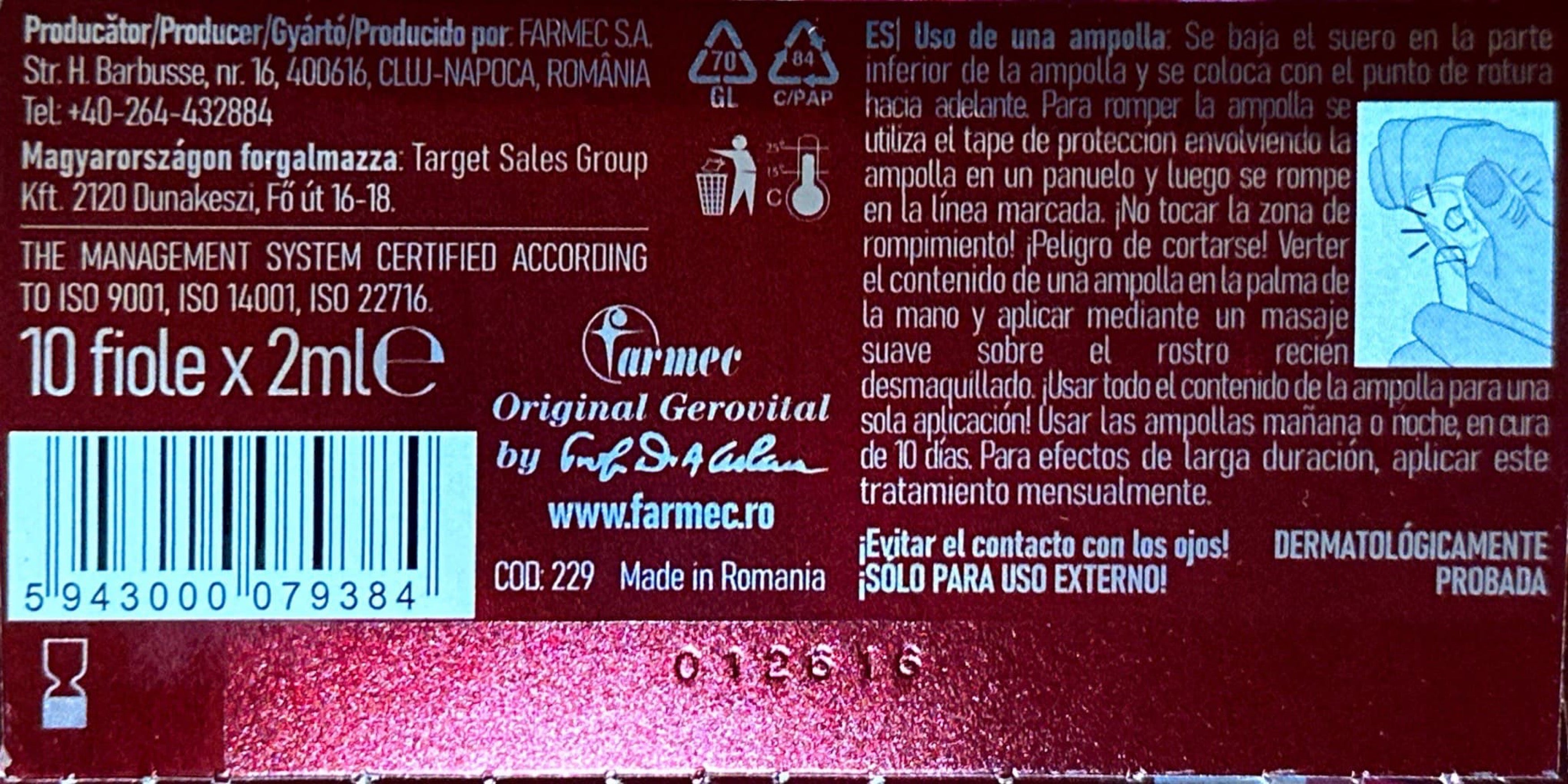 Nachdem das Serum eingezogen ist, tragen Sie Ihre tägliche Pflegecreme aus der Gerovital H3 Evolution-Serie auf. Die Ampullen sind, ähnlich wie bei Arzneimittelverpackungen, entlang des gesamten Halsumfangs vorgeschnitten. Eine Anleitung zum Öffnen der Ampullen finden Sie in Text- und Bildform auf der Verpackung. Jede Ampulle ist nur zum einmaligen Gebrauch und ausschließlich zur äußerlichen Anwendung bestimmt. Dermatologisch getestet.