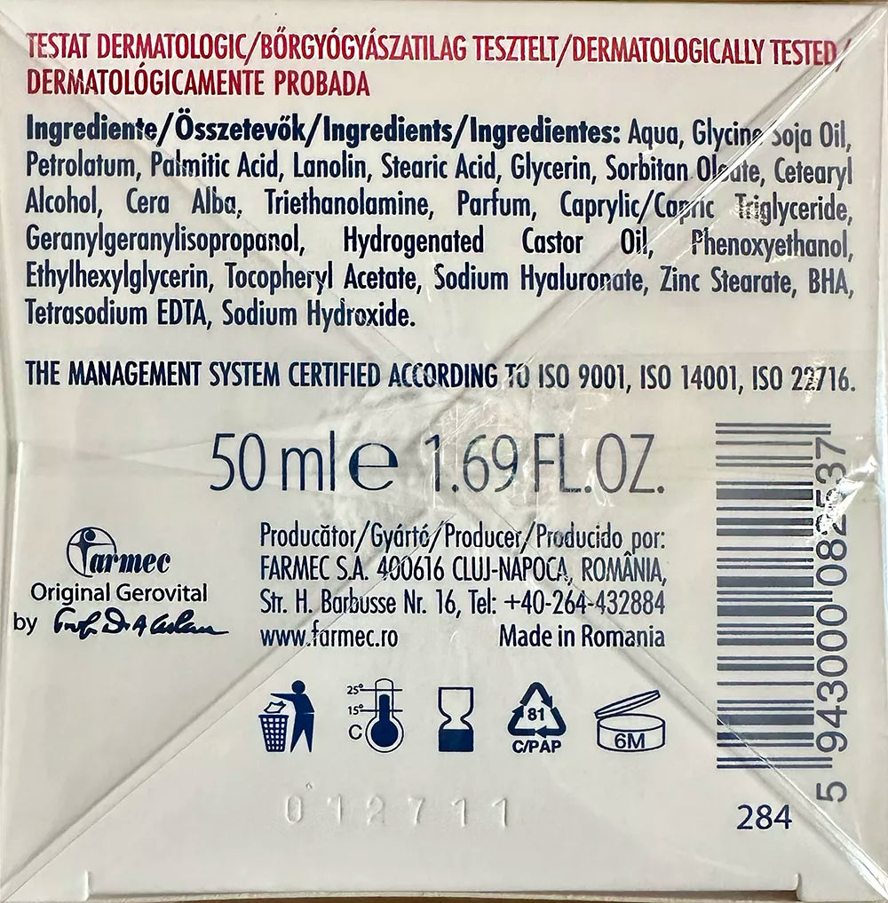 Farmecs langjährige Tradition der Exzellenz garantiert, dass jedes Produkt, einschließlich dieser intensiv pflegenden Feuchtigkeitscreme, den strengen Standards der EU-Kosmetikverordnung entspricht. Dieses Engagement gewährleistet, dass unsere Produkte nicht nur wirksam, sondern auch sicher und von höchster Qualität sind.