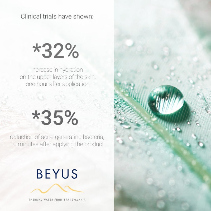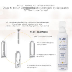 Das Thermalwasser von BEYUS stammt aus 2500 m Tiefe aus dem Trias-Aquifer des Apuseni-Gebirges im Beiuș-Becken. Es wird direkt an der Quelle in sterilen Sprühbehältern mit BOV-Technologie („Bag-on-Valve“) aufbereitet. Diese Technologie bietet den Vorteil, die Reinheit des Produkts zu erhalten, den Sprühstrahl in jedem Winkel zu steuern, eine vollständige Entleerung zu ermöglichen und die Umwelt zu schonen.