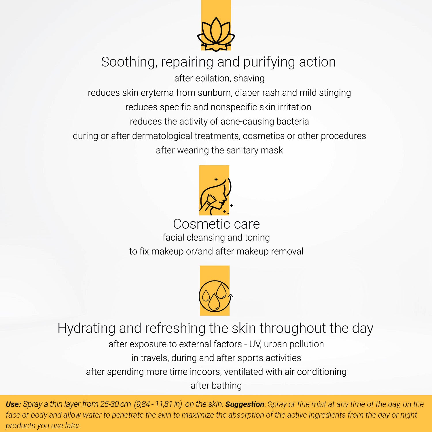 Spray a fine layer 25-30 cm onto the skin. Spray a delicate mist at any time of the day, on the face or body, and let the water penetrate the skin to maximize the absorption of active ingredients from the day or night products you use afterwards.