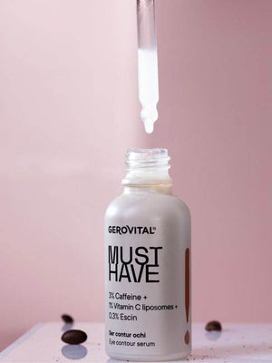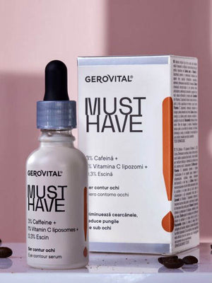 Gerovial Must Have Eye Contour Serum is designed to restore the beauty and radiance of the delicate area around the eyes. The association of pure Caffeine and liposomal Vitamin C prevents and improves the installation of a dull appearance, the appearance of inflammation, dark circles, edema, the decrease of elasticity and tone.