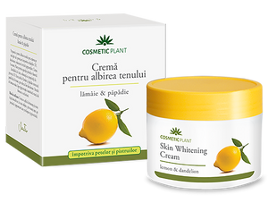 Cosmetic Plant Skin Whitening Cream with Lemon and Dandelion Extract - a 50 ml cream that diminishes dark spots and prevents freckle formation. This cream is suitable for all skin types and all ages, and it comes in a plastic jar that is easy to use and store.