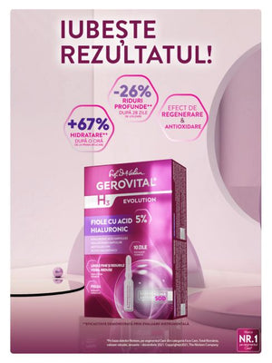 Fiole cu acid hialuronic Gerovital H3 Evolution, un tratament puternic și intensiv de 10 zile pentru o hidratare și rejuvenare a pielii de neegalat. Fiecare cutie conține 10 fiole a câte 2 ml fiecare, cu o concentrație puternică de 5% de acid hialuronic, concepute pentru a combate semnele vizibile ale îmbătrânirii și a îmbunătăți elasticitatea pielii, diminuând în același timp liniile fine și ridurile.